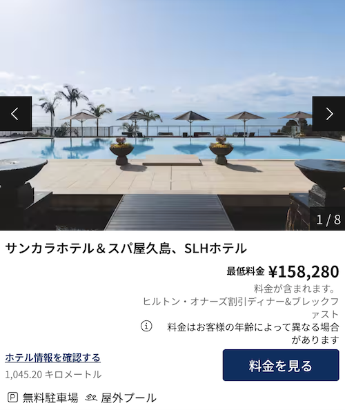 なぜ魅力的かというと、ヒルトン系列のホテルならどこでも宿泊できるためであり、1泊30万円以上するようなモルティブの超高級ホテルにも宿泊可能です。