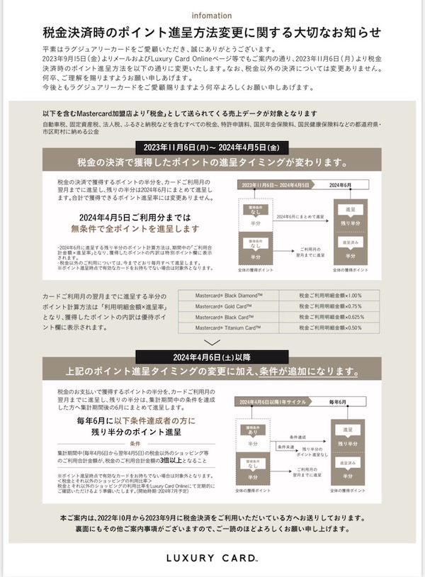 ラグジュアリーカードは、税金の支払い時にもポイント還元率が落ちませんが、条件がついているので注意が必要です。